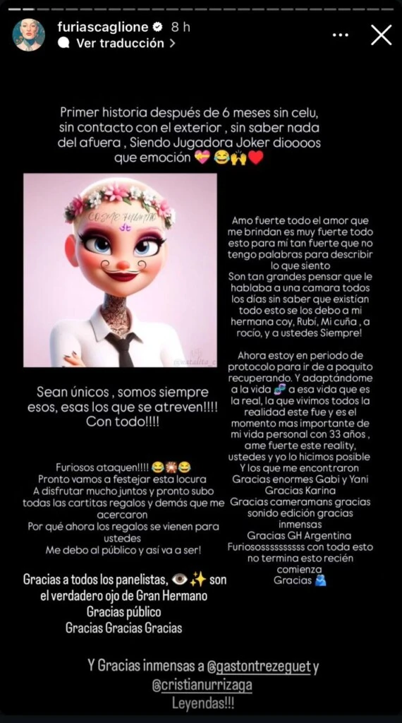 "Primera historia después de 6 meses sin celu, sin contacto con el exterior, sin saber nada del afuera. Siendo jugadora Jocker, Dios, qué emoción", comenzó escribiendo Furia junto a una ilustración suya, de la última cena de nominados.