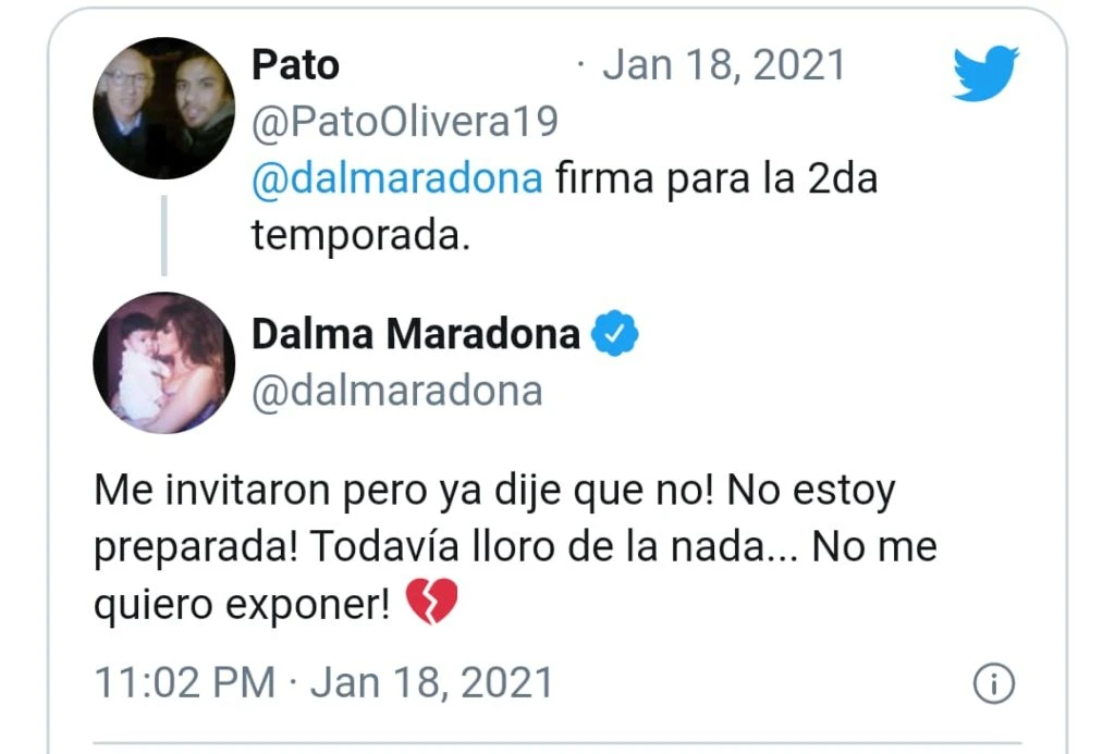 En las últimas horas se refirió a esto en sus redes sociales. Un seguidor le preguntó en Twitter si ya había firmado para la segunda temporada. “Me invitaron, pero ya dije que no. No estoy preparada. Todavía lloro de la nada... No me quiero exponer”, fue la frase con la que respondió, agregando un emoji de un corazón partido.