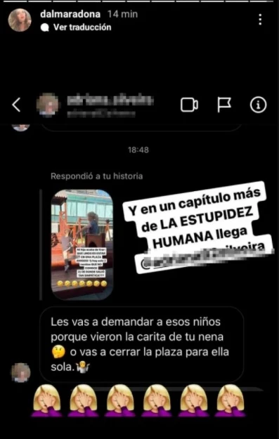 La hija de Diego Armando Maradona recibe a menudo mensajes de usuarios que la cuestionan por no mostrar el rostro de su hija Roma. Puntualmente, critican que publique fotografías de sus hijasde espaldas para resguardar su identidad. Cansada de la negatividad que recibe a diario, Dalma salió al cruce de sus detractores.