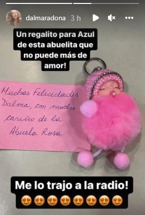 Luego se emocionó porque una oyente le llevó su primer presente. "Un regalito para Azul de esta abuelita que no puede mas de amor", escribió junto a una foto de un llavero con una bebita y una tierna notita firmada bajo el nombre de "Abuela Rosa".