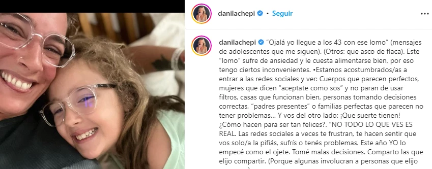“‘Ojalá yo llegue a los 43 con ese lomo’ (mensajes de adolescentes que me siguen). Otros: ‘qué asco de flaca’”, comenzó en un posteo que acompaña una foto con su hija. “Este ‘lomo’ sufre de ansiedad y le cuesta alimentarse bien, por eso tengo ciertos inconvenientes. Estamos acostumbrados/as a entrar a las redes sociales y ver cuerpos que parecen perfectos, mujeres que dicen ‘aceptate como sos’ y no paran de usar filtros, casas que funcionan bien, personas tomando decisiones correctas, ‘padres presentes’ o familias perfectas que parecen no tener problemas… Y vos del otro lado: ¡Qué suerte tienen! ¿Cómo hacen para ser tan felices?”, remató.
