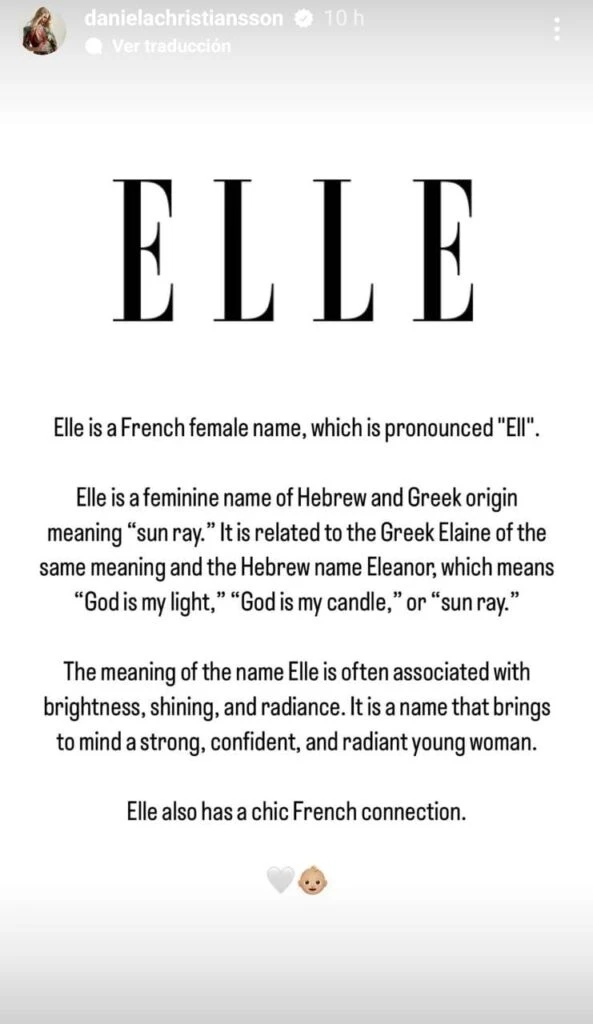 La flamante mamá compartió un extenso texto en inglés explicando el significado del nombre de su primera hija. "Es un nombre femenino francés que se pronuncia EL. Es de origen hebreo y griego, y significa rayo de sol", comenzó.