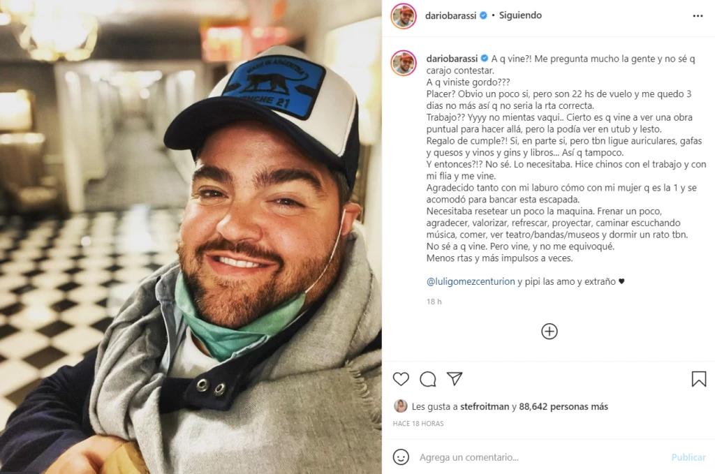 Agradecido tanto con mi laburo como con mi mujer que es la uno y se acomodó para bancar esta escapada. Necesitaba resetear un poco la máquina. Frenar un poco, agradecer, valorizar, refrescar, proyectar, caminar escuchando música, comer, ver teatro/bandas/museos y dormir un rato también", dijo.