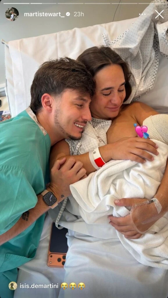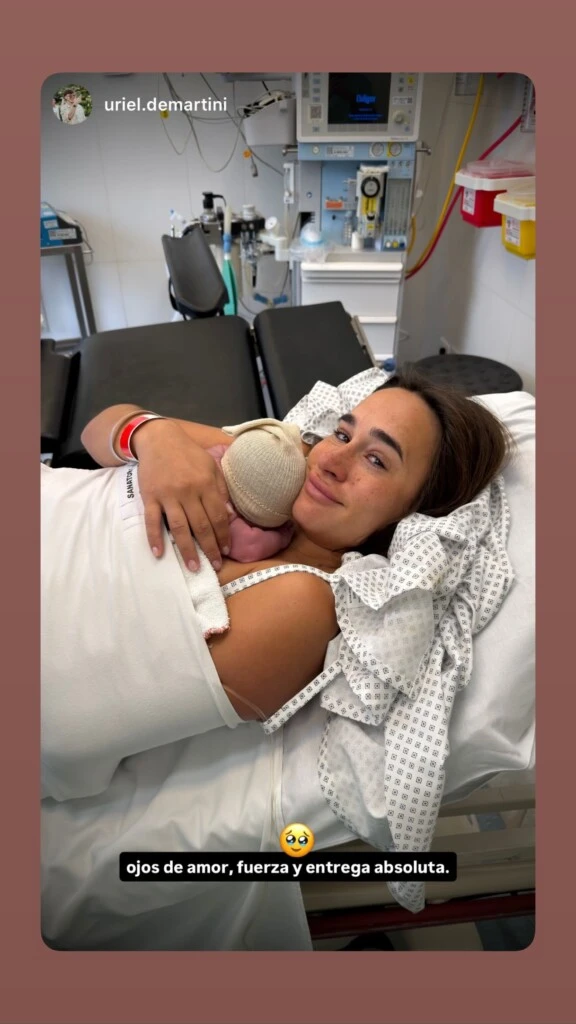 En una de las primeras imágenes que circularon, se pudo ver a Martina recostada en la cama del sanatorio, con lágrimas en los ojos y una sonrisa serena, mientras sostenía a su beba recién nacida sobre el pecho. La escena fue acompañada por una frase simple y poderosa: “Ojos de amor, fuerza y entrega absoluta”, escribió, dejando ver la intensidad del momento.