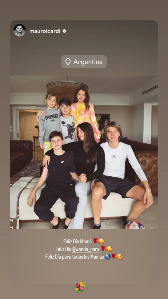 Por otra parte, para Wanda Nara esta fecha fue una emocionante ocasión de reencuentro familiar con todos sus hijos. Así lo reflejó en sus redes, compartiendo una foto hogareña junto a sus cinco hijos: Valentino, Constantino, Benedicto, fruto de su relación con Maxi López y Francesca e Isabella, nacidas de su relación con Mauro Icardi.
