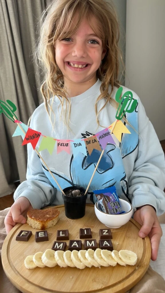 Mauro aprovechó la ocasión para saludarla a la madre de sus hijas en este día y también compartió el especial desayuno que las más pequeñas le hicieron a Wanda, compuesto de banana, chocolates con letras que formaban el saludo, un scon con forma de corazón y un alfajor.