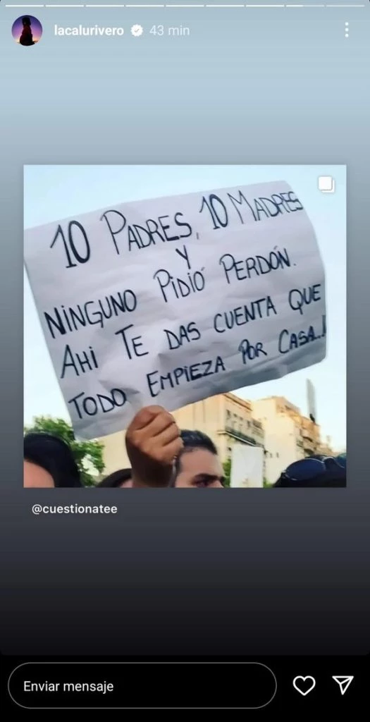Incluso, Calu Rivero quien se encuentra radicada en el país vecino de Uruguay se mostró muy al tanto del caso y compartió a través de sus redes sociales una reflexión sobre el accionar de las familias de los rugbiers que en ninguna oportunidad se pusieron en contacto con la familia de Fernando ni le dieron sus condolencias. "10 padres, 10 madres y ninguno pidió perdón. Ahí te das cuenta que todo empieza por casa...!", puede leerse en la fotografía compartida por la actriz.