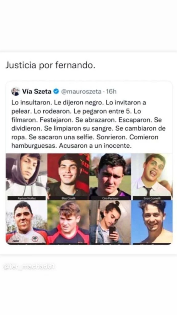 En la misma línea Flor de la V reposteó una publicación del periodista Mauro Szeta en la que el mismo explicaba la discriminación, violencia verbal y física, seguida de un abandono de persona que realizaron los acusados con total impunidad. A estas palabras la conductora agregó: "Justicia por Fernando"