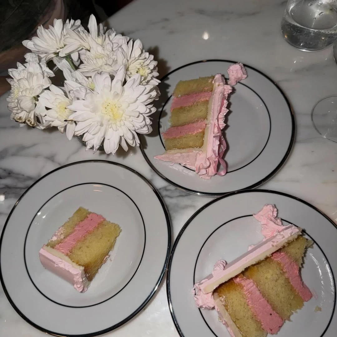 La protagonista indiscutida fue una torta de cuatro pisos en color rosa pastel, decorada con cintas y detalles de glasé que evocan el estilo romántico y retro de las “vintage cakes”, tendencia que arrasa en redes sociales. Cada nivel estaba adornado con delicadas guirnaldas y moños, logrando un diseño elegante y sofisticado. En la parte superior, cinco velas largas en tono rosa completaban la escena perfecta para el momento del deseo. Cuando llegó la hora de cortar, se reveló su interior: bizcochuelo esponjoso con relleno de crema rosa, que se sirvió en porciones sobre vajilla blanca con bordes plateados, junto a un centro de flores blancas.