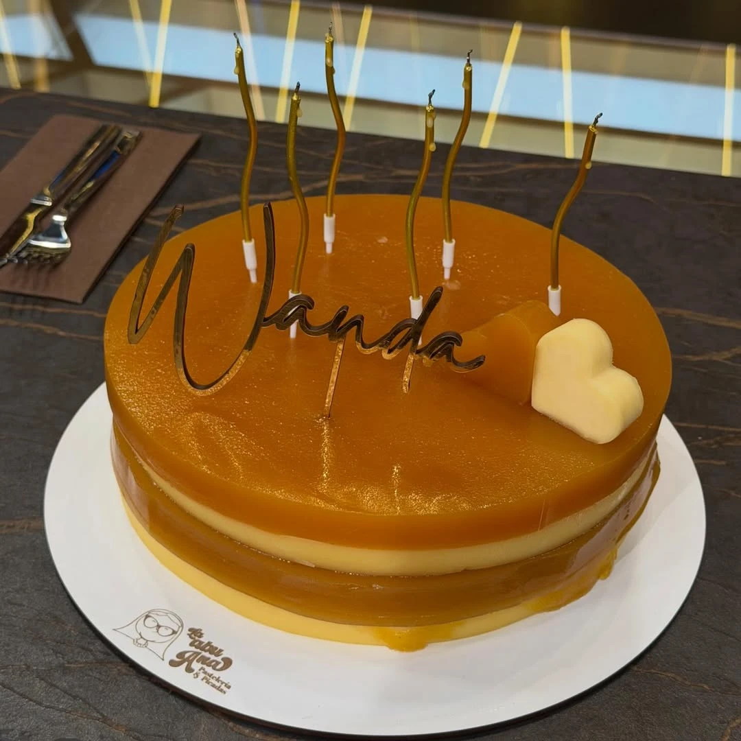Pero eso no fue todo. Wanda también recibió dos tortas adicionales que causaron sensación por su originalidad. La primera, un guiño a la tradición argentina, imitaba el clásico postre "vigilante" o también conocido como “fresco y batata”: capas de dulce de batata y queso, con terminación brillante y un topper que llevaba su nombre en letras doradas. Sobre la superficie, seis velas doradas y dos corazones de batata y queso unidos, que aportaban el toque final.