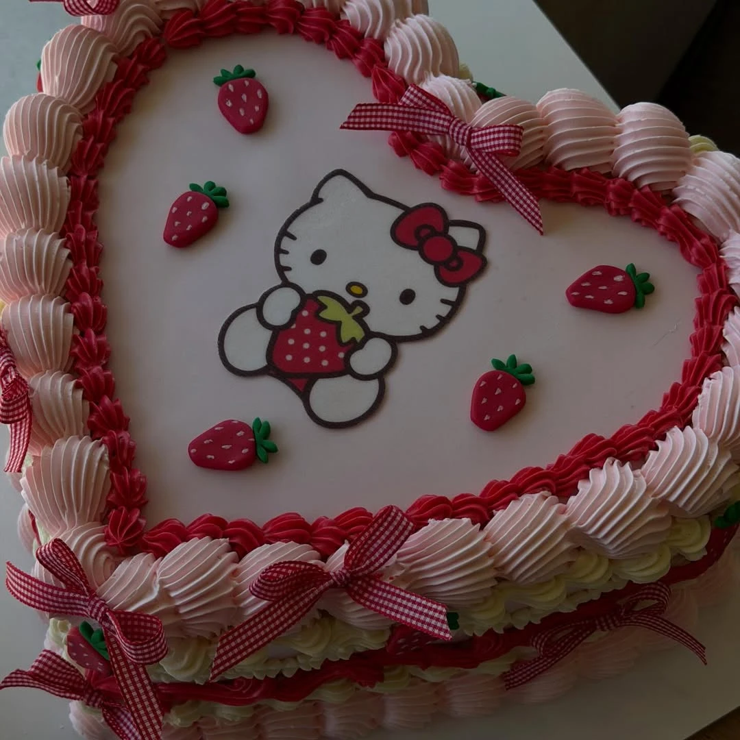 La segunda torta fue pura ternura: un diseño de Hello Kitty en forma de corazón, decorado con crema en tonos rosa y blanco, pequeñas frutillas y la icónica gatita sosteniendo una fresa en el centro. El borde estaba realzado con moños de cinta roja, reforzando el espíritu kawaii que enamoró a sus seguidores.