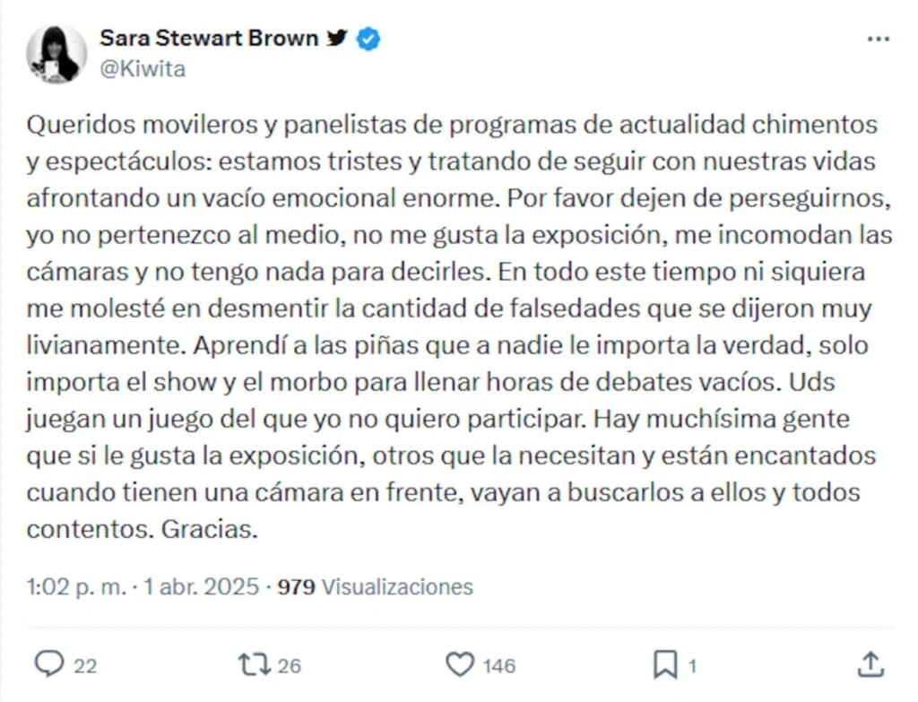 Marcovecchio se defendió y no descartó que pueda comenzar accionar legales en contra de la empresaria por sus fuertes dichos. Bárbara Lanata por su parte, se desligó del tema y aseguró que era una interna en la que no tiene nada que ver, y Sara Stewart rompió el silencio este martes: "Queridos movileros y panelistas de programas de actualidad chimentos y espectáculos: estamos tristes y tratando de seguir con nuestras vidas afrontando un vacío emocional enorme", comenzó escribiendo en su perfil de X (antes Twitter).