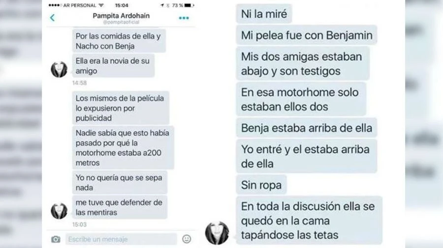 Si bien tanto Eugenia como Benjamín lo negaron por un buen tiempo, las pruebas de su “delito” siguieron apareciendo. Entre ellos, salieron a la luz chats de la modelo donde le contaba a una amiga más detalles del momento en el que encontró a la pareja en la intimidad del motorhome. “Ni la miré (a la China Suárez), mi pelea fue con Benjamín, mis dos amigas estaban abajo y son testigos. En esa motorhome solo estaban ellos dos, Benja estaba arriba de ella, yo entré y él estaba arriba de ella, sin ropa. En toda la discusión ella se quedó en la cama tapándose las tetas”, describió Pampita en los mensajes que se filtraron hace algunos años.