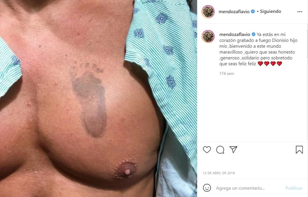 "Ya estás en mi corazón grabado a fuego, Dionisio, hijo mío. Bienvenido a este mundo maravilloso. Quiero que seas honesto, generoso, solidario pero sobre todo que sea feliz", escribió el coreógrafo en el pie de la fotografía donde se puede ver la marca del pequeño pie del bebé en su pecho.