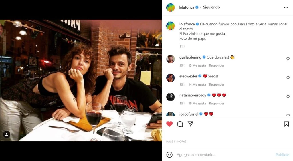 Si bien no se los suele ver seguido en compañía, ambos conservan muy buena relación y prueba de ello fue la última publicación que hizo la actriz en su cuenta de Instagram. "De cuando fuimos con Juan Fonzi a ver a Tomás Fonzi al teatro. El Fonzinismo que me gusta. Foto de mi papi", escribió junto a una adorable postal donde se los ve muy unidos. Él, por su parte, sumó tres emojis de corazón en los comentarios.