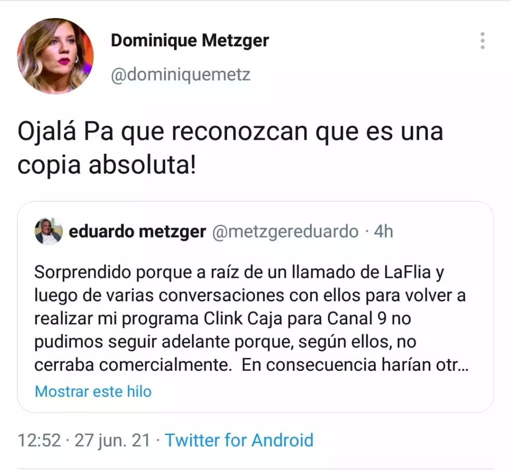 Citando la denuncia pública de Metzger, la periodista dejó sentada su postura. “Ojalá, pa. Que reconozcan que es una copia absoluta”, fue el mensaje claro y sin vueltas. Reclamo que se multiplica, incluso, entre los fanáticos del programa original, que ven al ciclo como una foto del que conducía Carámbula.