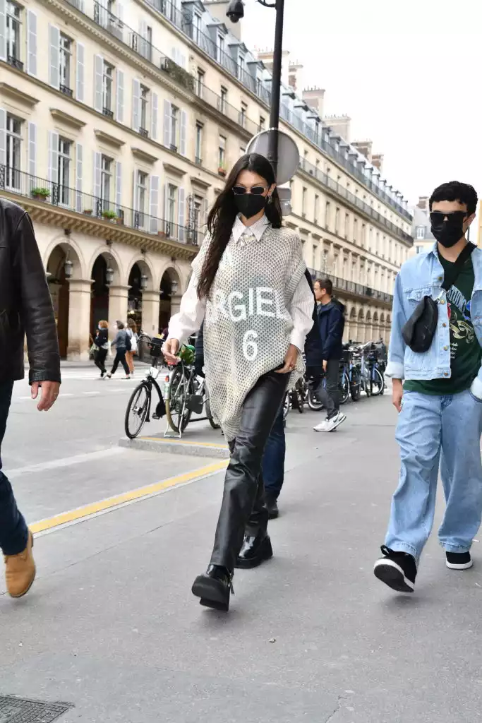 En su streetstyle nocturno, la supermodelo impactó con un úuper ancho pantalón blanco y un top negro apenas unido a la altura del busto, muy similar al vintage (y firmado por Jean Paul Gaultier) que lució hace unos días Hadid en la "Ciudad del Amor".