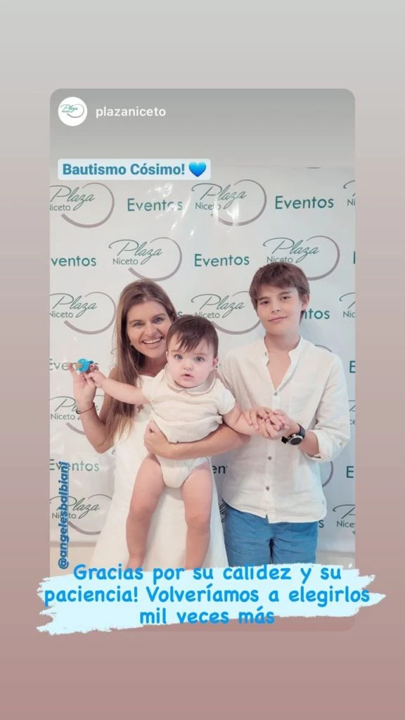 El 10 de diciembre de 2021 nació el segundo hijo de Angie Balbiani, Cosimo. El pequeño cumplió un año este sábado y, además, fue bautizado en la Parroqia Santa Elena, , la arquidiócesis de Buenos Aires. En un encuentro súper íntimo, el bebé recibió su primer sacramento.