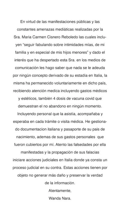 "En virtud de las manifestaciones públicas y las constantes amenazas mediáticas realizadas por la Sra. María Carmen Cisnero Reboledo las cuales incluyen seguir fabulando sobre intimidades mías, de mi familia y en especial de mis hijos menores' y dado el interés que ha despertado esta señora en los medios de comunicación les hago saber que nada se le adeuda por ningún concepto derivado de su estadía en Italia, la misma ha permanecido voluntariamente en dicho país recibiendo atención médica incluyendo gastos médicos y estéticos", comenzó la empresaria cosmética desde su cuenta de Twitter.