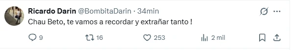 “Chau Beto, te vamos a recordar y extrañar tanto!”, escribió Darín en su cuenta de X apenas se conoció la noticia. Pero su despedida no terminó ahí. Horas después, salió al aire en A la Barbarossa (Telefe) y, visiblemente movilizado, habló largo y tendido sobre lo que significó Brandoni en su vida.