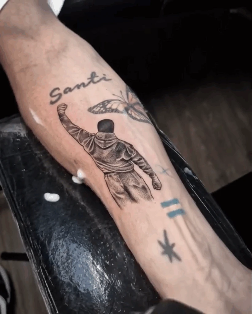 En el video que acompañó la publicación, se pudo ver el nuevo tatuaje que el actor se hizo en uno de sus antebrazos: el nombre “Santi” y, debajo, la icónica imagen de Rocky alzando el brazo, un símbolo de lucha, resiliencia y victoria personal. Un diseño que sintetizó todo lo que siente: la ausencia, el amor y la fuerza para seguir.