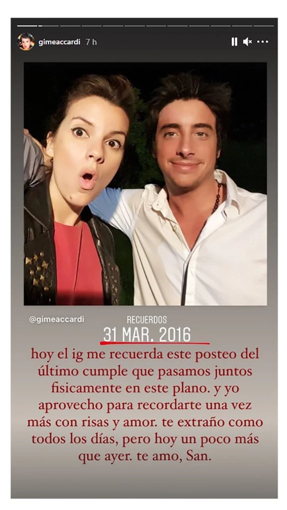 La actriz también hizo referencia a esta fecha y compartió una imagen de ambos a través de sus historias de Instagram: “Hoy el Instagram me recuerda este posteo del último cumple que pasamos juntos físicamente en este plano, y yo aprovecho para recordarte una vez más con risas y amor. Te extraño todos los días, pero hoy un poco más que ayer. Te amo, San”, expresó en una story.