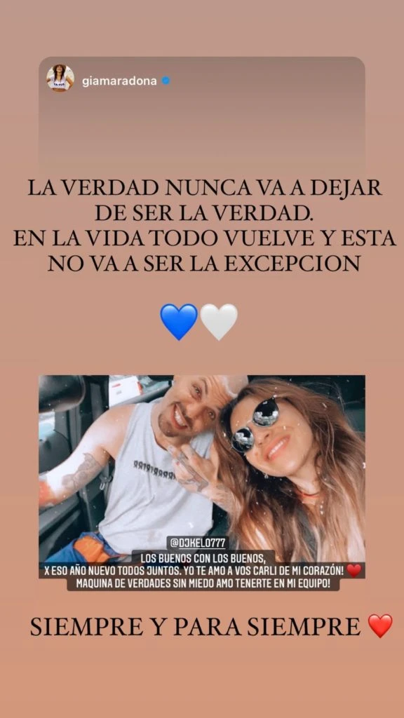 En una historia Gianinna escribió "Los buenos con los buenos. Por ese añi nuevo todos juntos. Yo te amor Carli de mi corazón, máquina de verdades sin miedo. Amo tenerte en mi equipo". Claramente, no sólo dio por sentado que todos los comentarios de su amigo eran ciertos sino también deja entrever qué piensa de Morla.