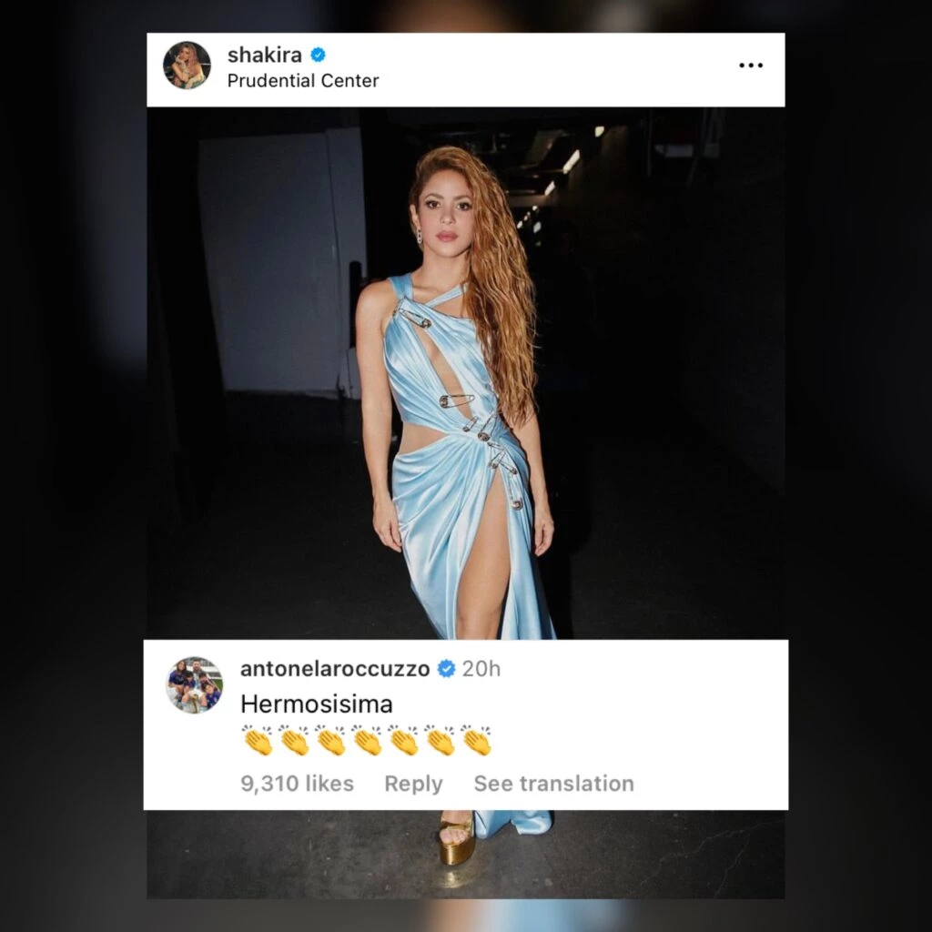 La reconocida artista e fue premiada en los MTV Video Music Awards impactó a todos al presentarse en el escenario con un impresionante vestido celeste. “Gracias Versace por este vestido especialmente personalizado en uno de mis colores favoritos”, escribió en su cuenta de Instagram personal y tras esto, recibió el halago de la esposa de Messi quien respondió con “Hermosísima” junto con unos emojis de aplausos.