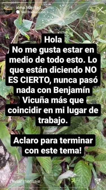 “Respecto al tema que me plantearon últimamente personas ajenas a mi entorno: de mi boca y de forma consciente, no van a salir palabras que puedan tener una finalidad destructiva. No estoy a favor de chismes ni rumores, lo encuentro una forma de comunicación de muy baja vibración. Creo, apoyo, vivencio y comparto otras formas de comunicación que generen amor, compasión, paz, alegría, empatía... Por ende, mi actuar y mi hablar irán siempre direccionados hacia ese tipo de vibración. Deseo luz a toda esa situación. Transmutación, perdón y cura”, escribió.
