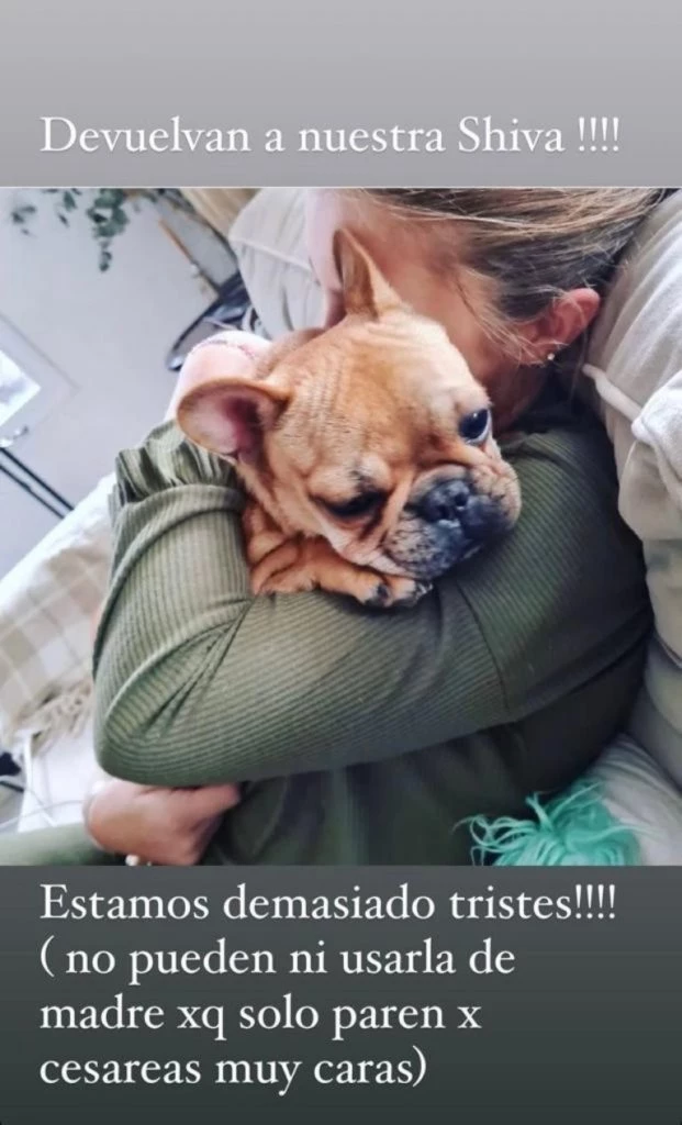 Por otra parte, le solicitó a sus seguidores que quien tenga alguna información le escriba por privado a su cuenta de Instagram. En la imagen se ve a la cachorra con una de sus hijas, las dos durmiendo la siesta. “Devuelvan a nuestra Shiva. Estamos demasiados tristes”, dijo y advirtió: “No pueden usarla ni como madre porque sólo paren por cesárea y son muy caras”.