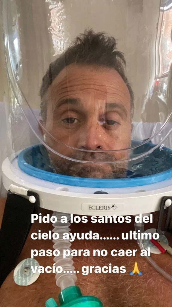 El periodista continúa preocupado por su estado. Pero no pierde el humor. Ayer le colocaron un casco de oxígeno para asistirlo en la respiración y con una selfie compartió su pedido más desesperado, cargado de esperanza. "Pido a los santos del cielo ayuda... Último paso para no caer en el vacío", decía y concluía su mensaje con manos en oración y diciendo "gracias", tal vez con la certeza de que recibirá esa ayuda que tanto espera.