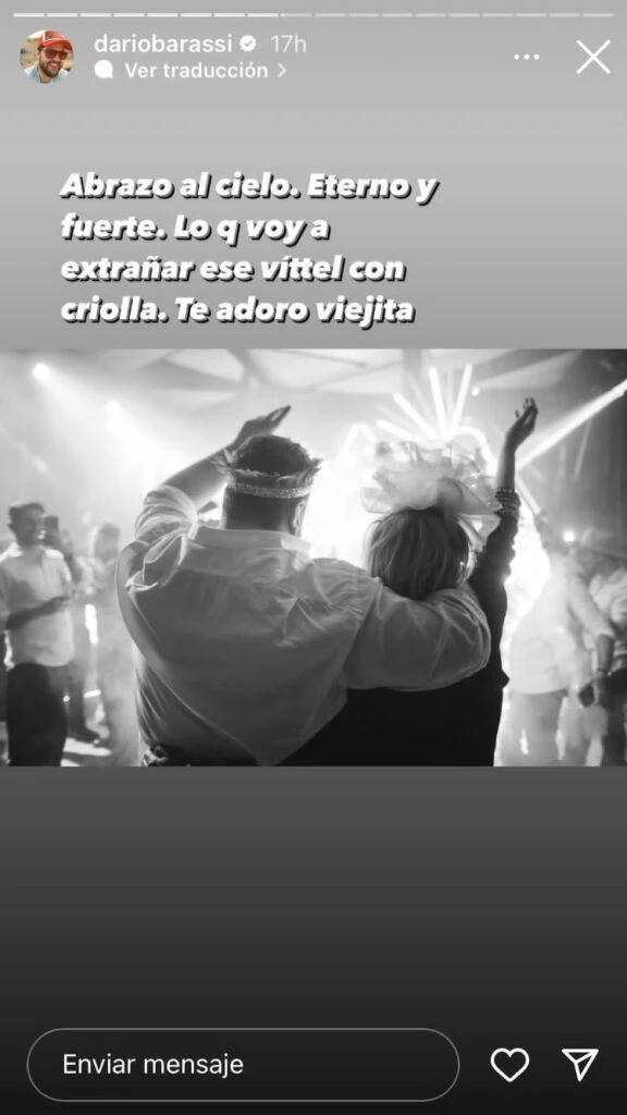 "Abrazo al cielo. Eterno y fuerte. Lo que voy a extrañar ese vittel con criolla. Te adoro viejita", escribió Barassi en una historia que compartió en su cuenta personal de Instagram y que lo tenía a él de espaldas junto a su madre.