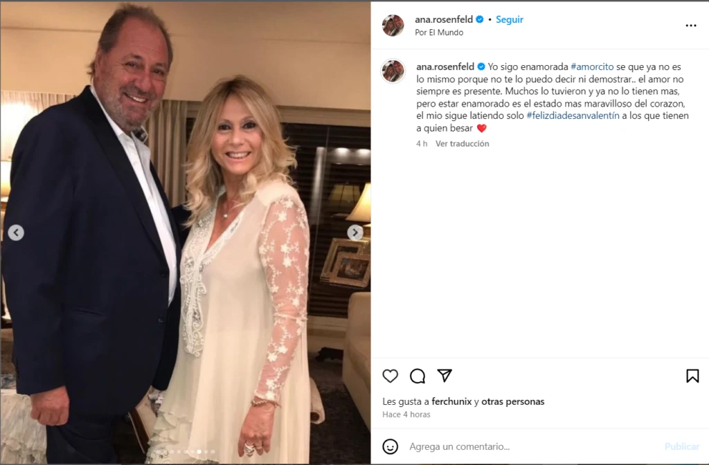 En el posteo, que consistió en un carrusel de fotos junto a su marido, Ana afirmó: “Muchos lo tuvieron y ya no lo tienen más, pero estar enamorado es el estado más maravilloso del corazón, el mío sigue latiendo solo”.
