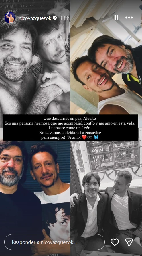 “Que descanses en paz, Alecito. Sos una persona hermosa que me acompañó, confió y me amo en esta vida. Luchaste como un León. No te vamos a olvidar, si a recordar para siempre! Te amo!”, escribió Nicolás, dejando en claro que para él se fue mucho más que un agente.