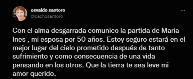 Desde su cuenta de Twitter, Osvaldo escribió: "Con el alma desgarrada comunico la partida de María Inés, mi esposa por 50 años", y continuó: "Estoy seguro estará en el mejor lugar del cielo prometido después de tanto sufrimiento y como consecuencia de una vida pensando en los otros".