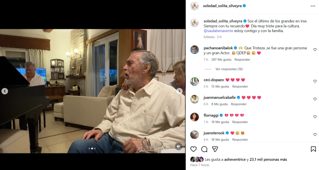 En ese posteo, varios actores se sumaron a su dolor. Aníbal Pachano por ejemplo escribió: "Que tristeza, se fue una gran persona y un gran Actor. QDEP". Cecilia Dopazo, Flor Raggi, Juan Otero Peña, el hijo de Flor Peña, y Georgina Barbarossa, entre otros más, también comentaron esa publicación de Solita con corazones y mensajes de amor.