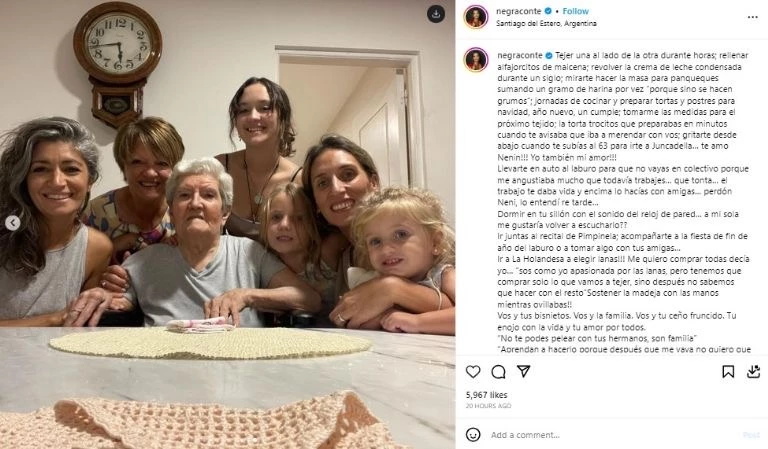 Luego, agregó: “Puedo seguir durante horas… La cantidad de escenas es infinita. La mejor abuela del mundo. Ya sé que fuiste la única que conocí, pero no importa… La mejor. Lo diste todo y más. Gracias por el amor incondicional, Neni, por los besos con ruido, los mimos, los abrazos, las historias, las lanas y los tejidos y arranco todo otra vez…”.