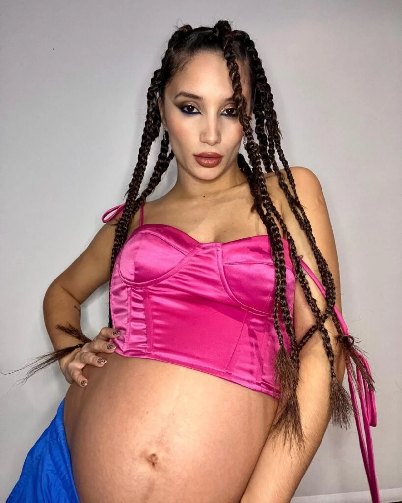 A este look trenzado le sumó extensiones extremas que llegan hasta su cintura. En las fotos se la ve luciendo un top fucsia furioso y un pantalón deportivo azul francia que realzan su pancita de embarazo.
