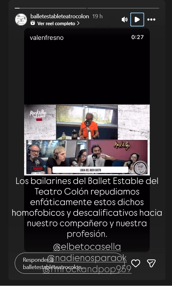 "Los bailarines del Ballet Estable del Teatro Colón repudiamos enfáticamente estos dichos homofóbicos y descalificativos hacia nuestro compañero y nuestra profesión", indicaron en una historia de Instagram sobre el video del momento en que se burlaron de su miembro en el mencionado ciclo radial.