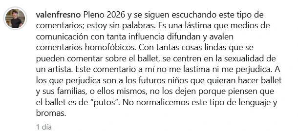 Luego profundizó sobre el impacto que este tipo de expresiones pueden tener más allá de lo personal. “Con tantas cosas lindas que se pueden comentar sobre el ballet, se centren en la sexualidad de un artista. Este comentario a mí no me lastima ni me perjudica. A los que perjudica son a los futuros niños que quieran hacer ballet y sus familias, o ellos mismos, no los dejen porque piensen que el ballet es de ‘putos’. No normalicemos este tipo de lenguaje y bromas”, expresó.