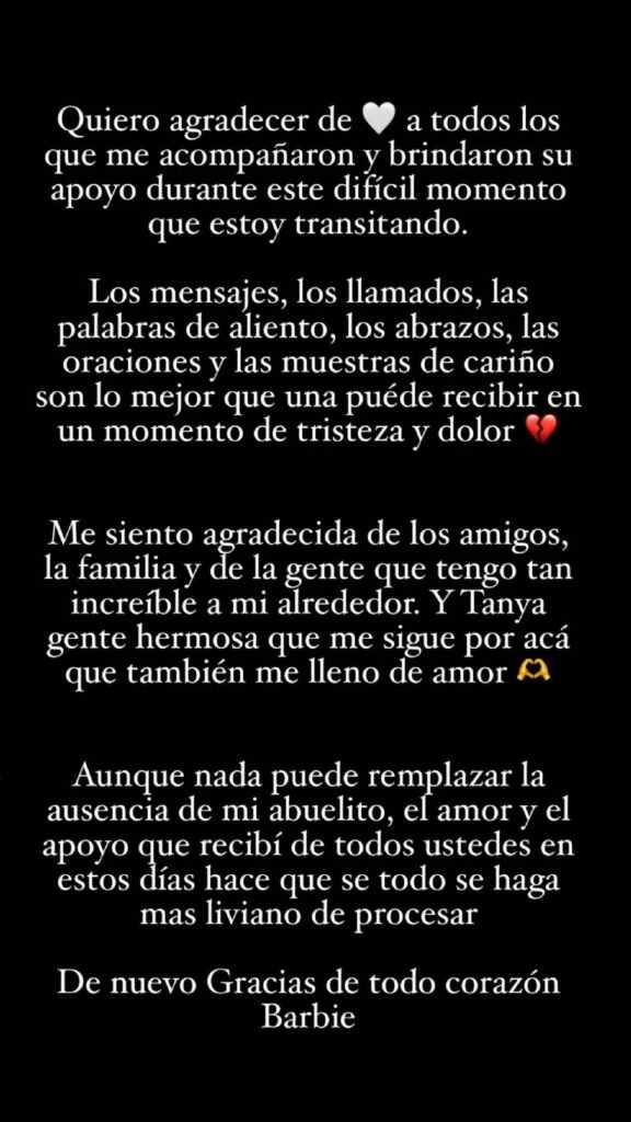 Por último, cerró el mensaje con un agradecimiento pleno: "Me siento agradecida de los amigos, la familia y la gente que tengo tan increíble a mi alrededor. Aunque nada puede reemplazar la ausencia de mi abuelito, el amor que recibí de todos ustedes hace que todo sea más liviano de procesar".