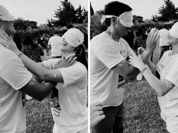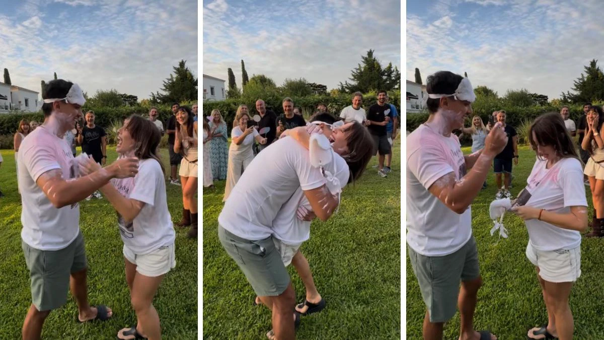 Según se puede ver en las imágenes, la pareja eligió una dinámica lúdica y original para descubrir la gran noticia. Ambos participaron con los ojos vendados y las manos cubiertas de pintura, mientras sus invitados observaban expectantes el momento. La consigna era simple: debían pintarse mutuamente sin saber qué color estaban utilizando.