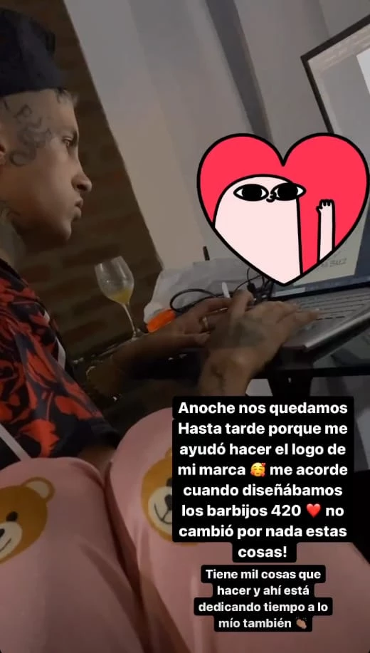 “Anoche nos quedamos hasta tarde porque me ayudó hacer el logo de mi marca”, comenzó diciendo Tamara Báez en una historia de Instagram en la que podía verse al cantante de ‘cumbia 420’ muy concentrado frente a la computadora de su casa.