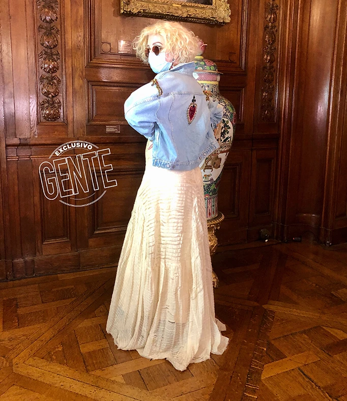 Con una melena corta y con ondas, anteojos redondos y barbijo quirúrgico, Nacha se inspiró en un estilo ochentas que remite a la Madonna de Like a Virgin con enormes aros y colgante con cruces con piedras, a juego con el bordado de la espalda de la chaqueta.
