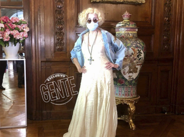 Con una melena corta y con ondas, anteojos redondos y barbijo quirúrgico, Nacha se inspiró en un estilo ochentas que remite a la Madonna de Like a Virgin con enormes aros y colgante con cruces con piedras, a juego con el bordado de la espalda de la chaqueta.