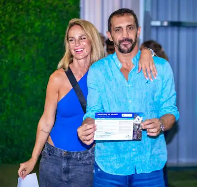En las imágenes que trascendieron -tal vez primeras fotos públicas como pareja- se ve a Sabrina abrazando a José mientras sostienen un certificado de premio. Mientras Chatruc luce camisa de lino celeste con textura, mangas arremangadas, pantalón azul al tono y reloj metálico; Rojas lleva un top azul eléctrico de líneas limpias, jeans grises de calce relajado con cinturón negro, cartera bandolera negra, reloj plateado y pulseras. Detrás, el espacio combina panel verde de follaje y estructuras metálicas propias de un área deportiva.