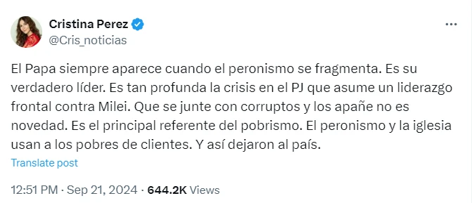 La periodista escribió en su cuenta de X (ex Twitter): “El Papa siempre aparece cuando el peronismo se fragmenta. Es su verdadero líder. Es tan profunda la crisis en el PJ que asume un liderazgo frontal contra Milei. Que se junte con corruptos y los apañe no es novedad. Es el principal referente del pobrismo. El peronismo y la iglesia usan a los pobres de clientes. Y así dejaron al país”.