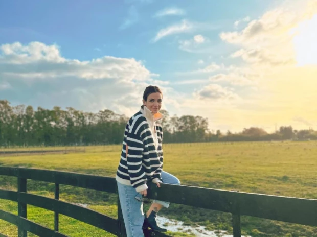 "Bueno, les voy a mostrar todos los detalles porque estoy chocha", exclamó la intérprete caminando por los bellísimos prados con caballos, carruajes antiguos y una amplia pileta que se extendia en el centro de la chacra .