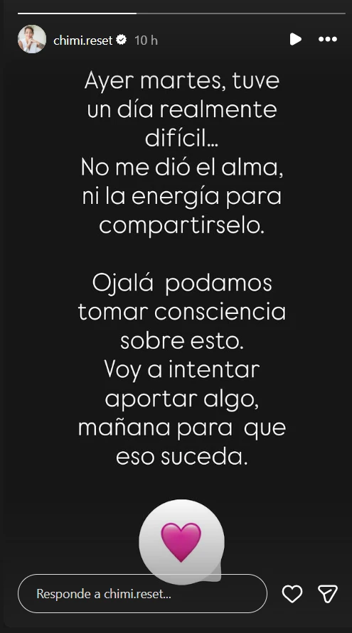 En sus historias de Instagram, Chimi optó por no dar detalles concretos de lo sucedido, pero dejó entrever que había atravesado una jornada cargada de angustia y reflexión. “Ayer martes, tuve un día realmente difícil... No me dio el alma, ni la energía para compartírselo. Ojalá podamos tomar consciencia sobre esto. Voy a intentar aportar algo, mañana para que eso suceda”, escribió, sin mencionar directamente el episodio de salud de su marido, pero generando inmediata conexión en quienes siguen de cerca la vida del flamante matrimonio.