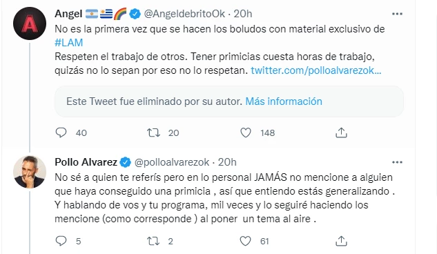 "No es la primera vez que se hacen los boludos con material exclusivo de #LAM. Respeten el trabajo de otros", le respondió Ángel de Brito. Y agregó: "Tener primicias cuesta horas de trabajo, quizás no lo sepan por eso no lo respetan".